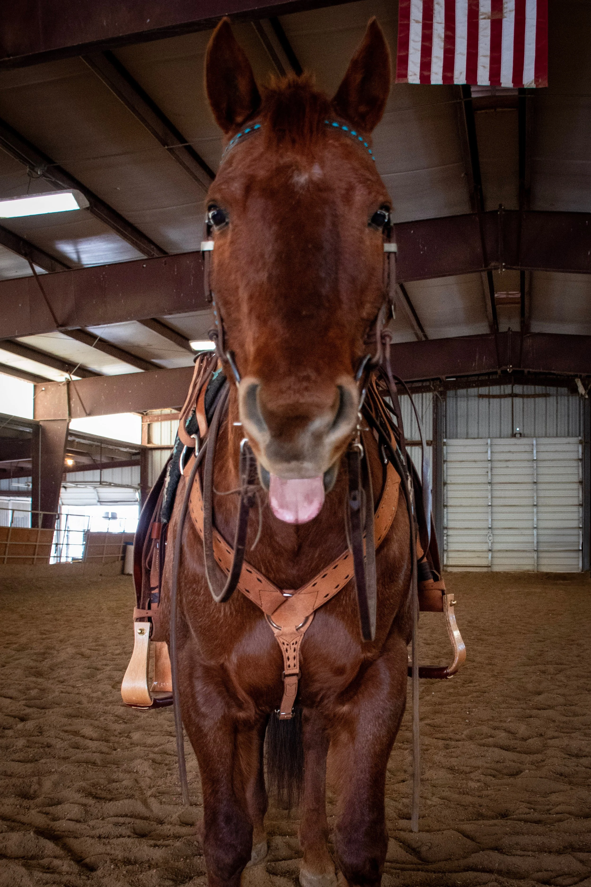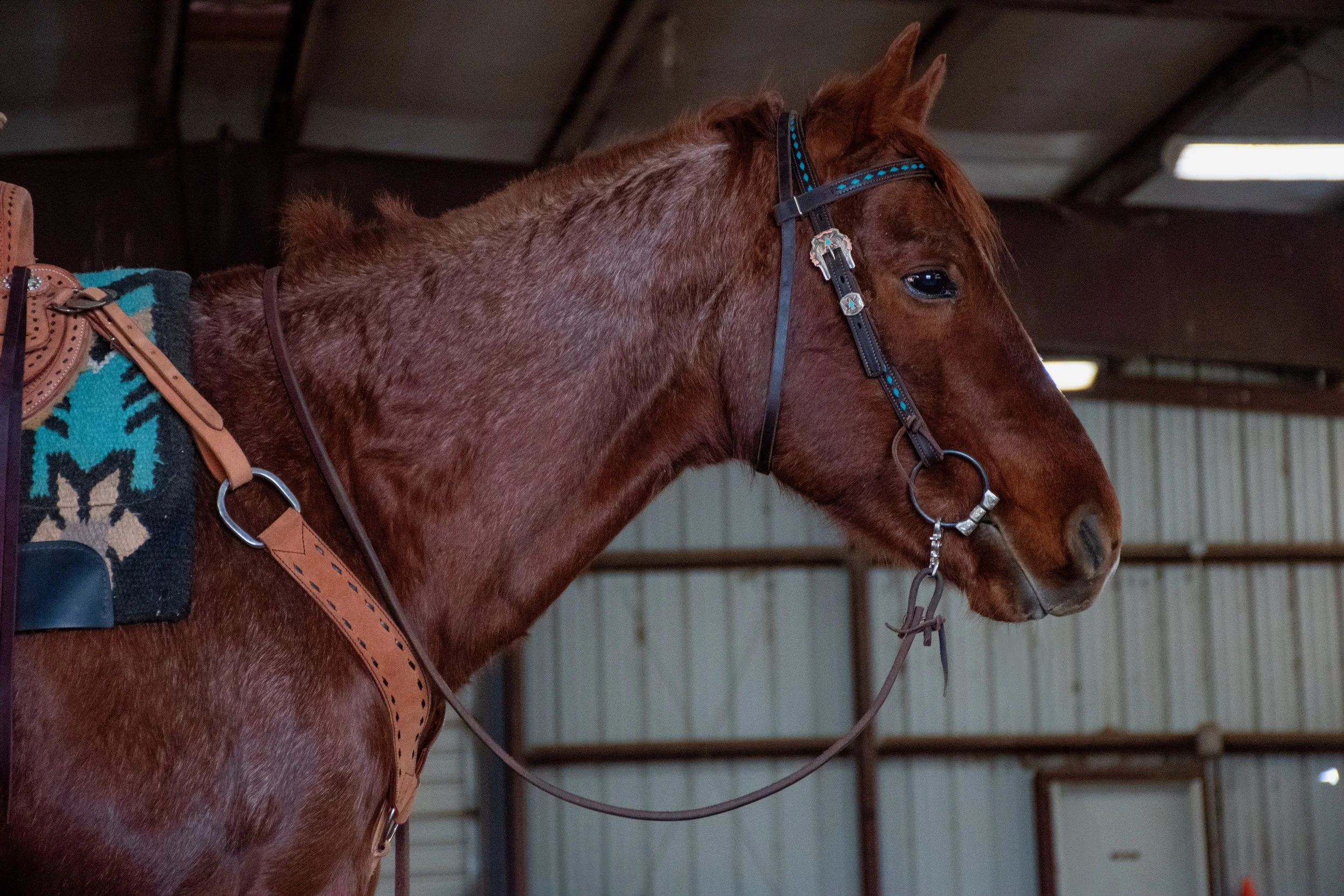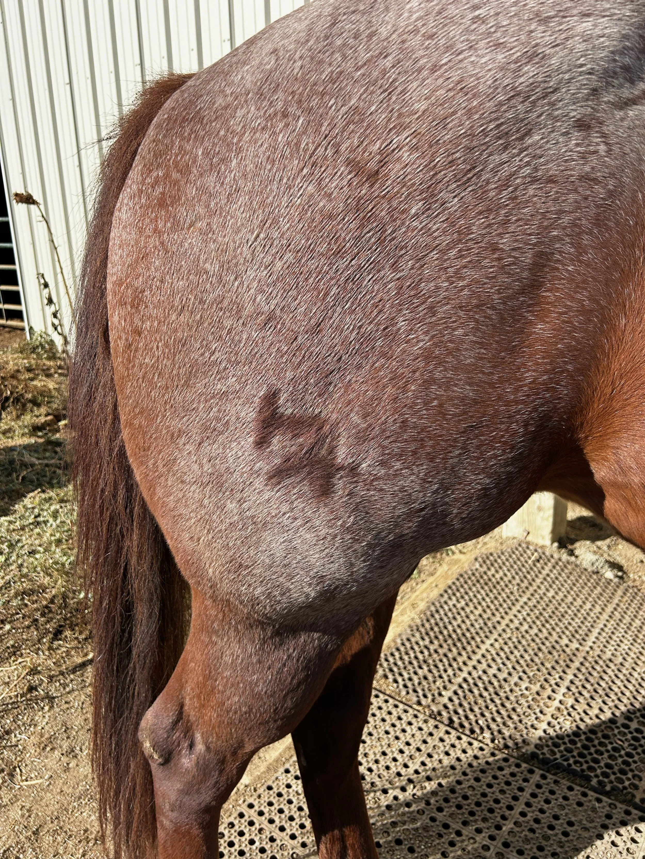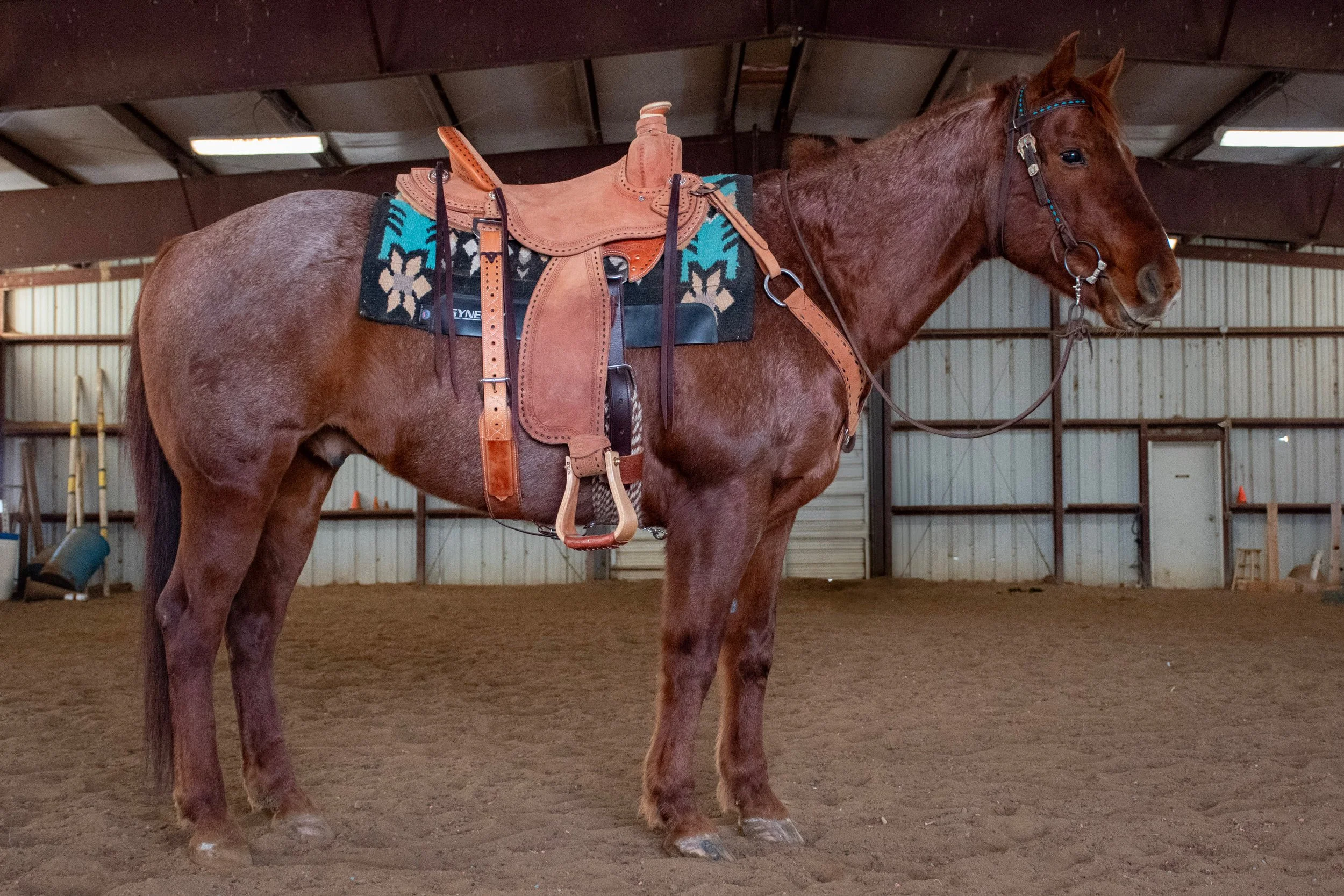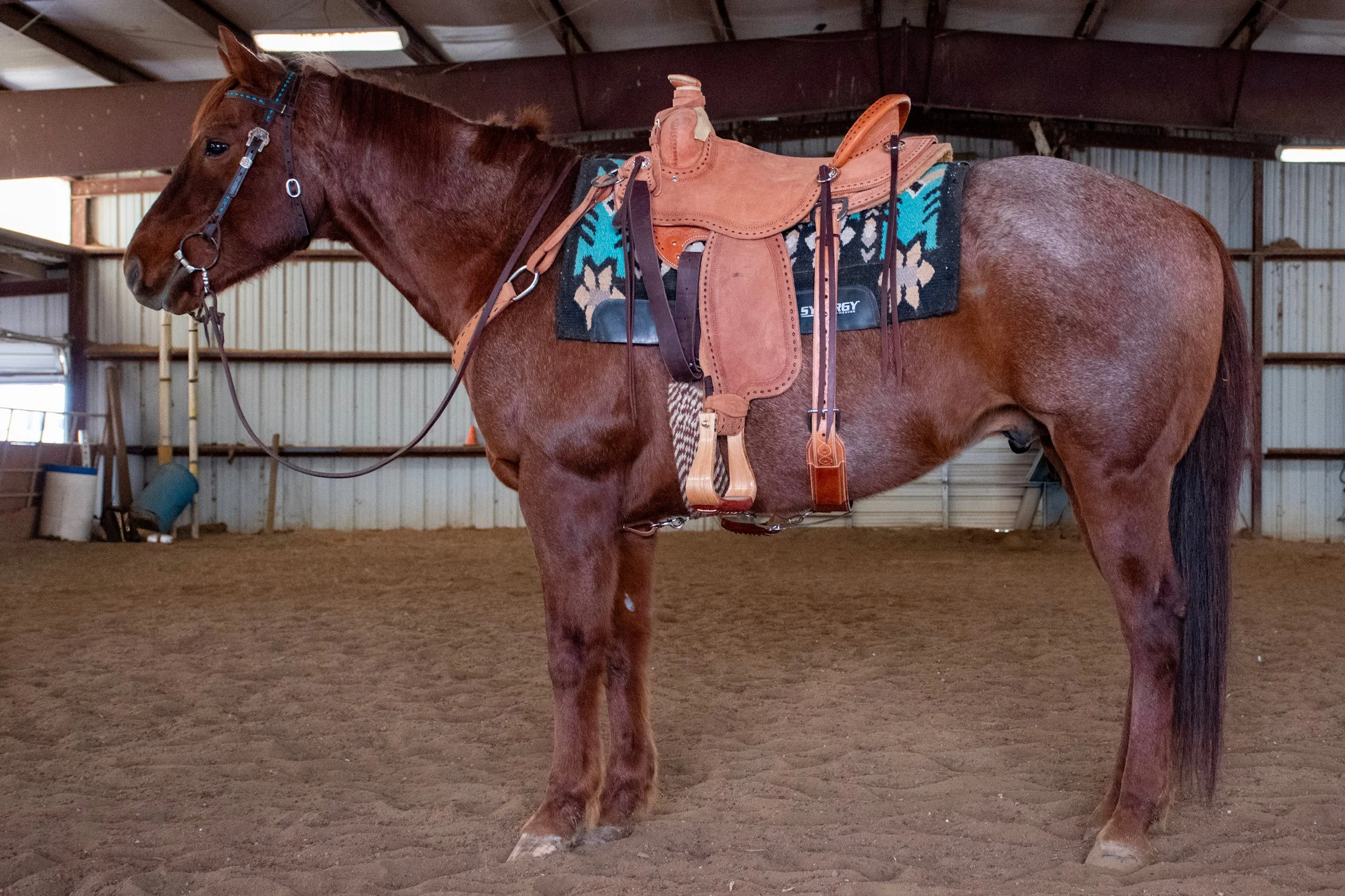 “Fred” is an 11 year old red roan grade Quarter Horse gelding standing 14.2 hands. Fred is a great all-around family horse. He is very willing on the trail! He crosses bridges, ditches, water, and opens gates. He’s been around cattle, worked the flag, drug ties, and will ground tie all day long. Fred carries a flag at the walk, trot, and lope, has been around gun fire, and is started on the barrel and pole patterns. This nice gelding does it all and can go in any direction you choose!